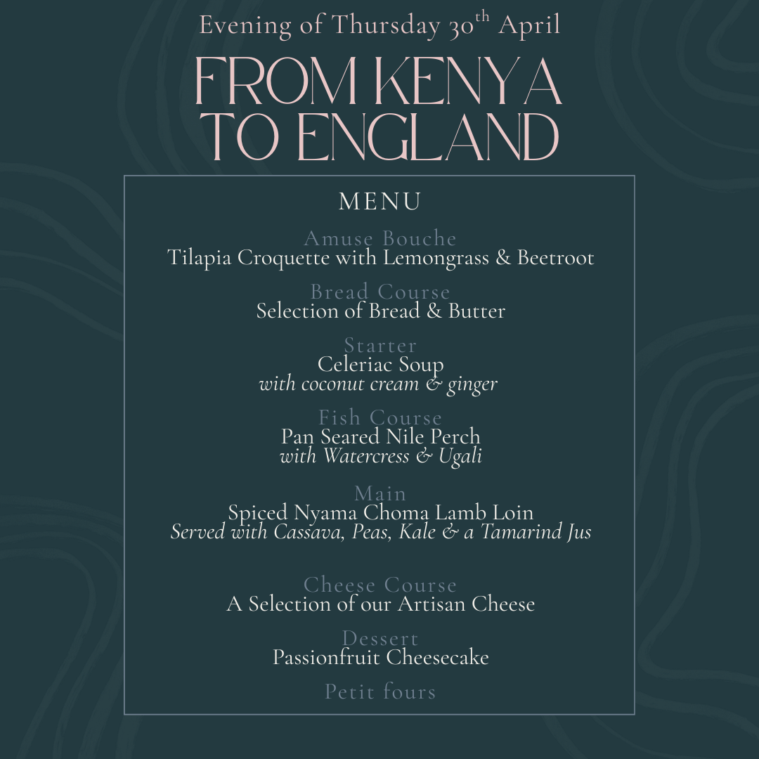 Experience a unique fine-dining journey where the vibrant flavours of Kenya meet the elegance of British cuisine. Inspired by our talented Kenyan chef, Shadrack, this intimate supper club celebrates bold spices, seasonal ingredients, and expertly crafted dishes in a refined, immersive setting. A limited-availability evening designed for adventurous palates seeking a sophisticated, unforgettable culinary experience.